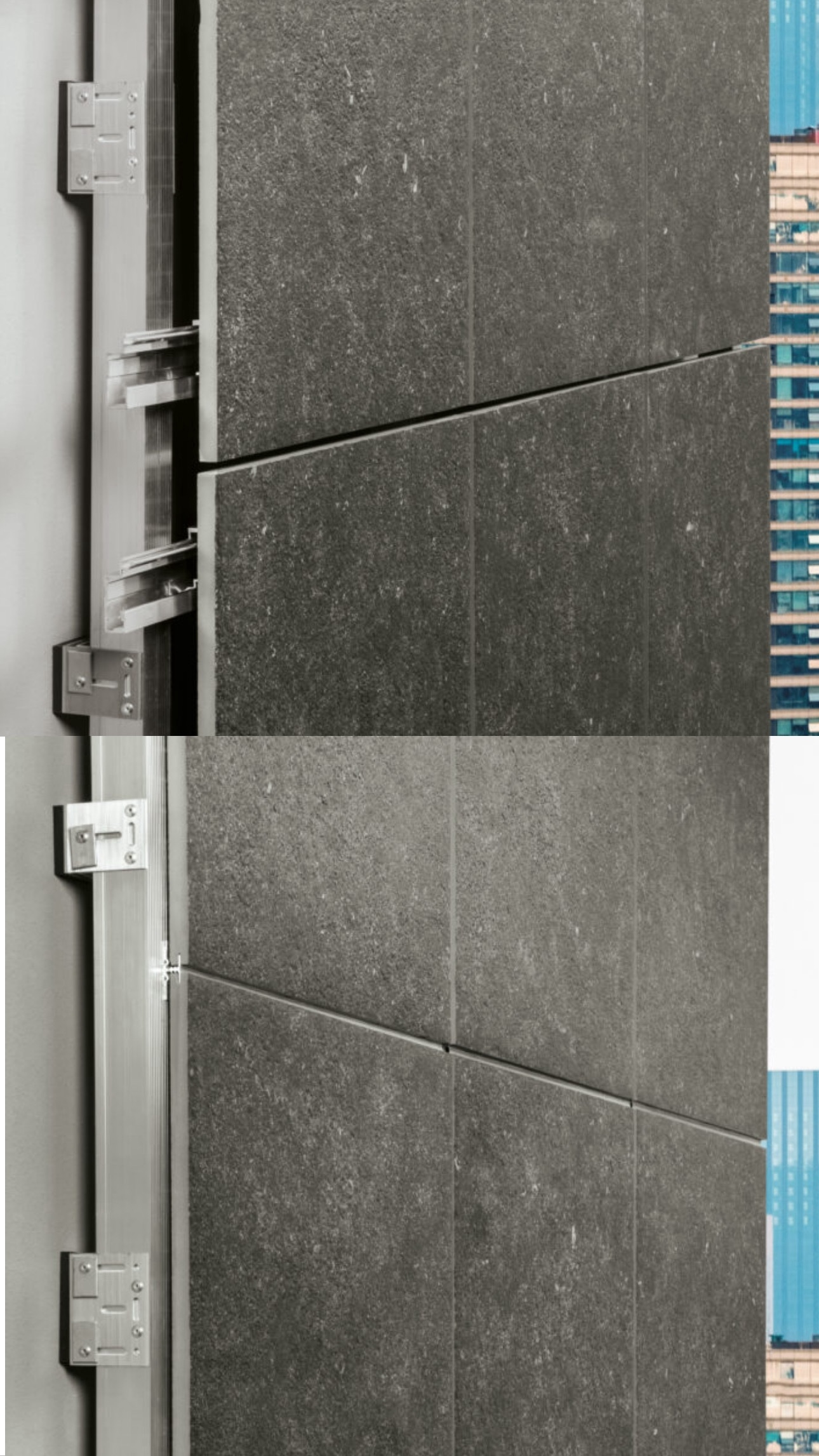 Вся гамма керамогранита Italon подходит для применения на фасадах с точки зрения морозостойкости и негорючести. Однако с инженерной точки зрения на фасады рекомендуются к применению реттифицированные виды керамогранита, т.к они позволяют выставить заранее шаг подсистемы, а также использовать разнообразные цвета и поверхности на одном фасаде. Для монтажа фасадной системы на скрытые крепления рекомендуется уличный керамогранит Italon Х2 толщиной 20 мм, который позволяет реализовать механическую обработку без существенной потери прочностных свойств плитки.