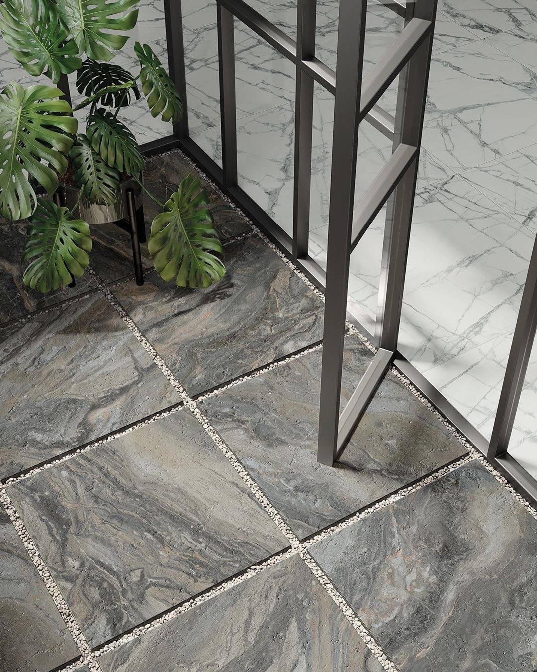 Керамогранит под сланец Materia Carbonio 60х60 cerato в паре с итальянскими орешником Maison Walnut 20х120 nat наполняют пространство природным уютом.